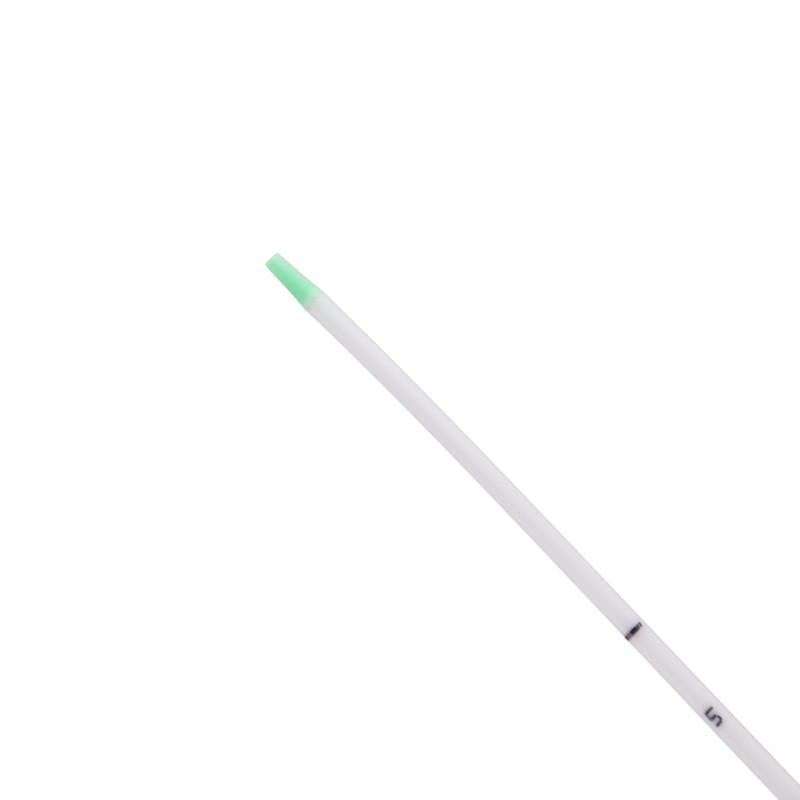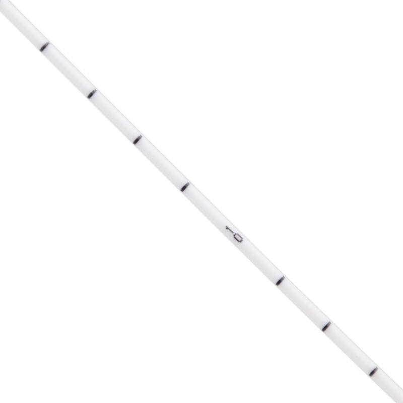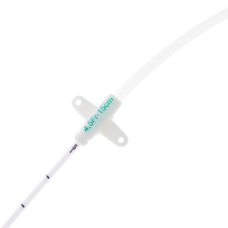 - 1 cathéter radio-opaque avec prolongateur intégré transparent, marquage centimétrique, clamp et flextip. Le cathéter est gradué tous les centimètres, à partir de 4 cm depuis l'extrémité distale.