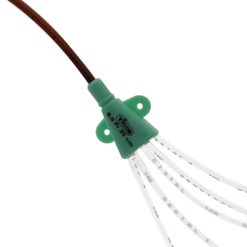 A l'extrémité proximale, les voies du cathéter sont raccordées à des tubes de jonction de différentes longueurs. Chaque tube de jonction comporte une embase de couleur différente et l’indication « Distal », « Medial 1», « Medial 2 », « Medial 3 » et « Proximale » afin de repérer facilement les différentes lignes de perfusion.